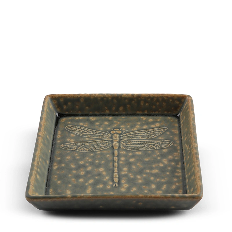 Olive green glazed square plate with a dragonfly relief design. Please note glaze will vary slightly.
