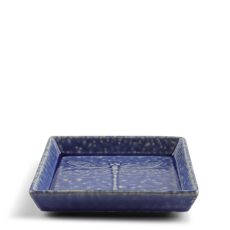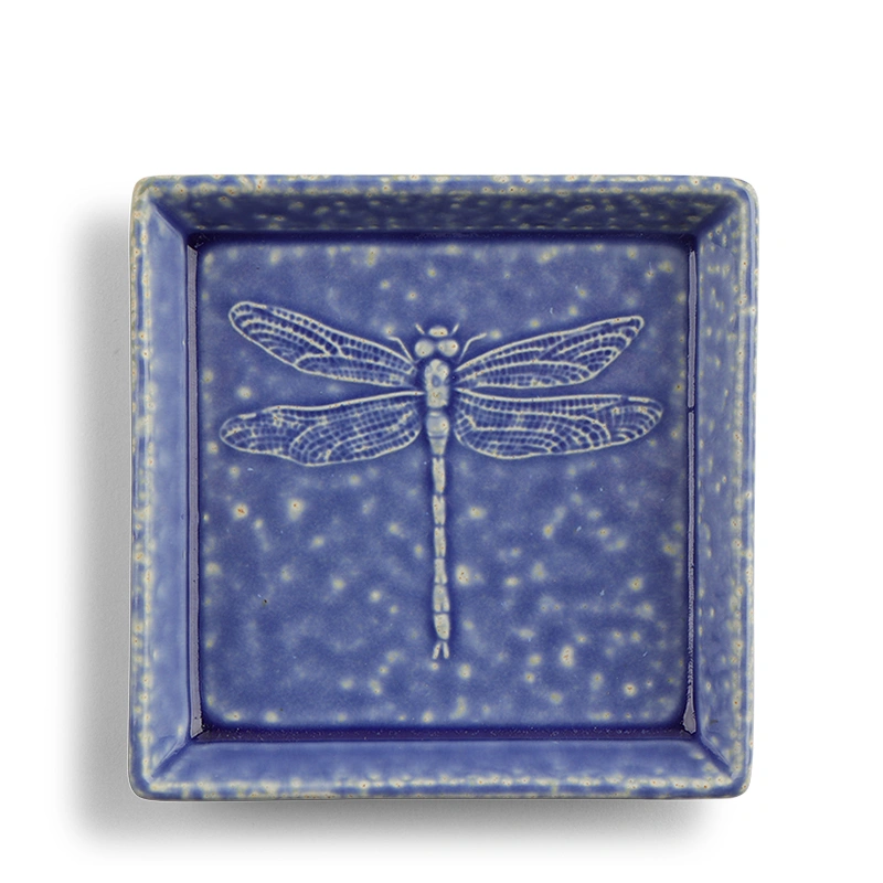 Blue glazed square plate with a dragonfly relief design. Please note glaze will vary slightly.