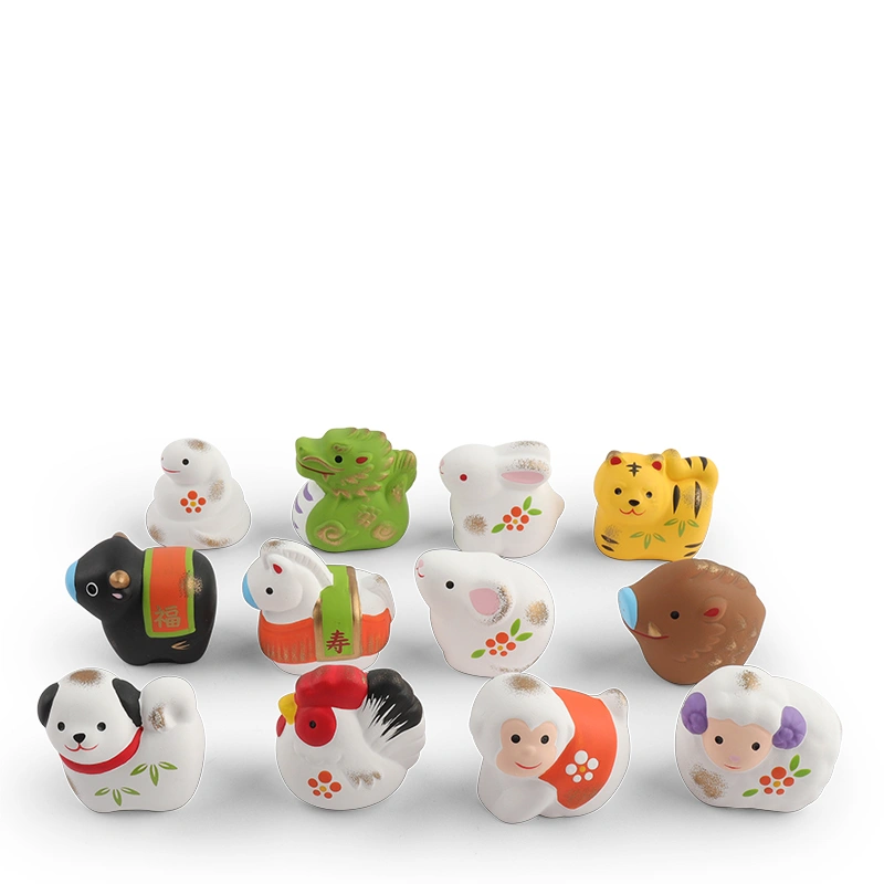 The 12-year cycle of the Chinese Zodiac chart has never been cuter. This set has 2 of each animal that can be merchandised in its own display box.
