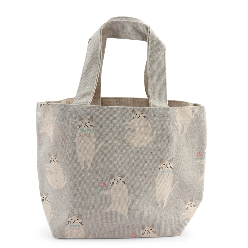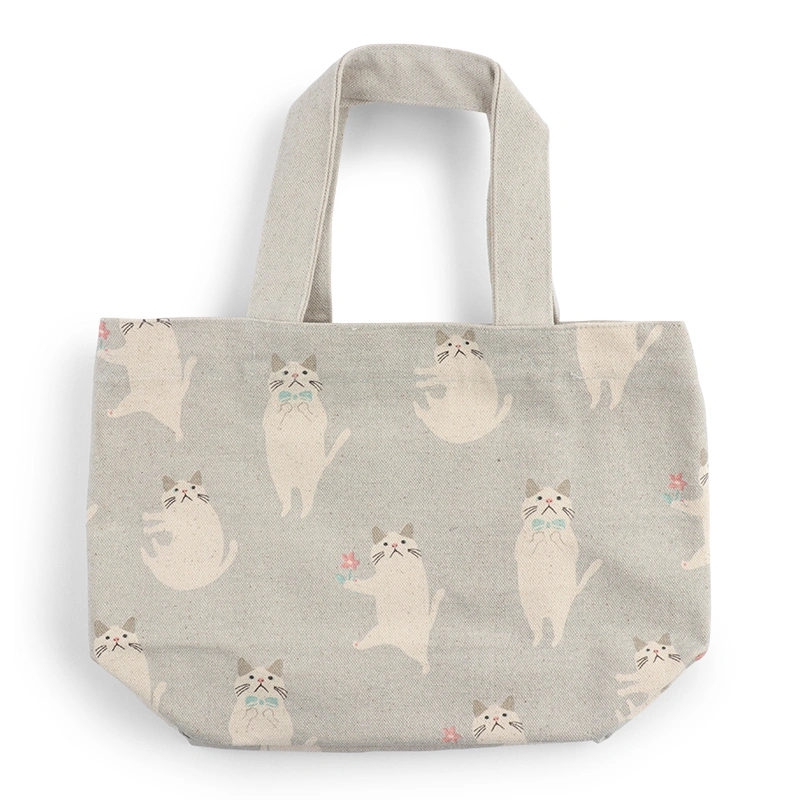 Light gray tote bag with white cat design. Design on both sides.