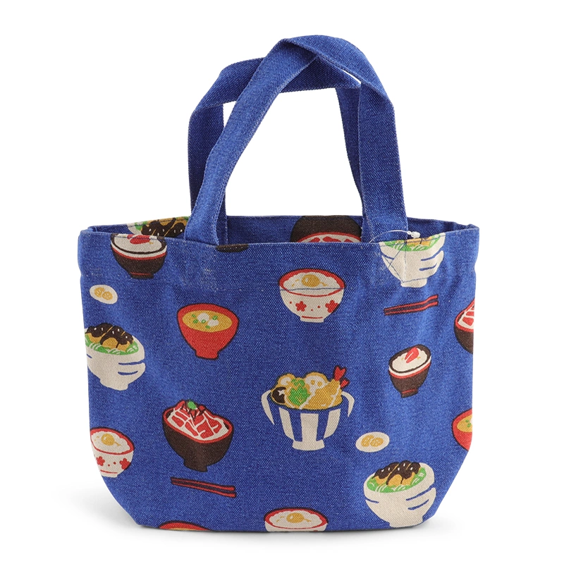 Blue tote bag with Japanese food design. Design same on both sides.